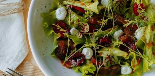 Салат с ростбифом, томатами черри, копченой вишней и кремом из сыра