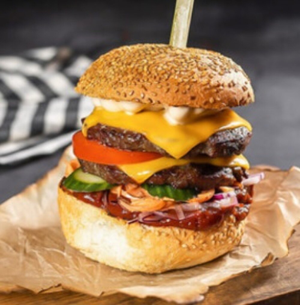 Две котлеты из мрамороной говядины, маринованый красный лук,сыр чеддер,свежие огурцы,свежий томат, свежая капуста,соус оливье, соус сацебели, паприка