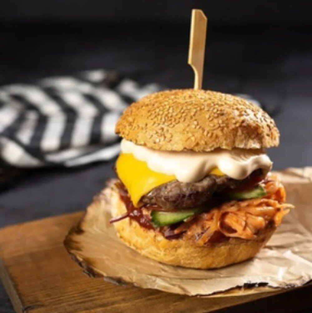 Котлета из мраморной говядины, маринованый красный лук,сыр чеддер,свежие огурцы,свежий томат, свежая капуста,соус оливье, соус сацебели, паприка
