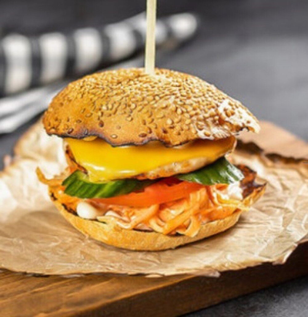 Куриная котлета, маринованый красный лук,сыр чеддер,свежие огурцы,свежий томат, свежая капуста,соус оливье, соус сацебели, паприка